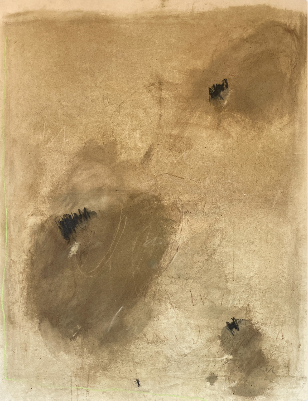 ‘Gestos hacia la Viriditas’ entrelaza una investigación impulsada por los materiales hacia una práctica artística más meditativa mediante el uso del líquen, con una lectura cercana de Hildegard von Bingen a la luz de la filosofía contemporánea, la ciencia y las preocupaciones espirituales y personales. El líquen, como organismo simbiótico entre planta y hongo, su crecimiento lento y el hecho de que siempre ‘vive con’ un soporte fueron las principales inspiraciones. Hablo de meditación en el sentido de repetir un mantra, aunque quizá los modelos de las órdenes benedictinas como Hildegard von Bingen sean más apropiados: su trabajo diario incluía repetir y reescribir oraciones, cantos y también cultivar y trabajar un terreno. Así comenzó el proyecto: trabajando lentamente el mismo lienzo con líquen una y otra vez, antes de pasar a obras que mostraban el proceso de capas dentro de la pintura (la serie ‘Being-with’), y más tarde a trabajos más libres inspirados en mis lecturas (por ejemplo, las obras ‘The Seven Stars’, ‘Tres’ y ‘No hay que buscarlo’).