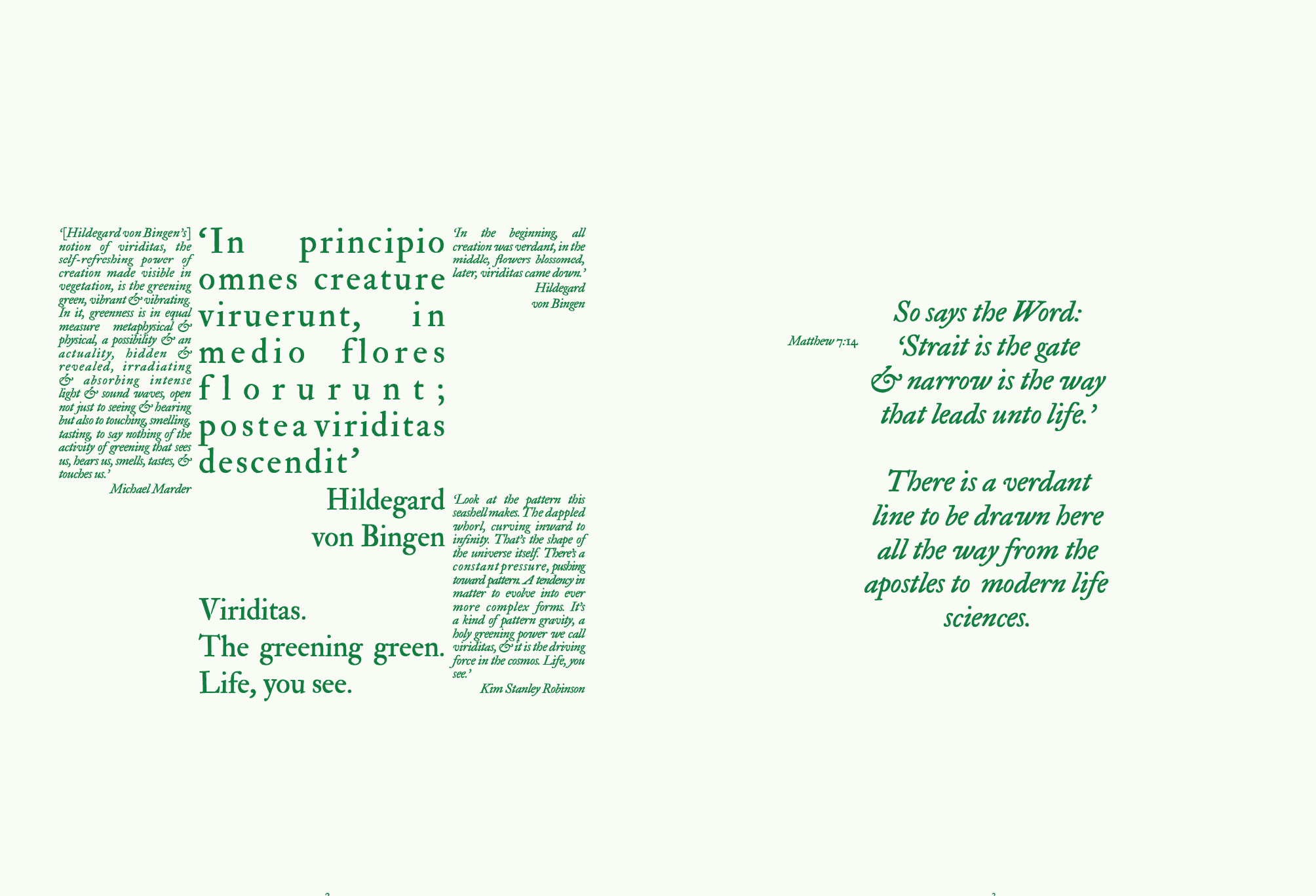 El libro que acompaña la obra, ‘Gestos hacia la Viriditas’, es una recopilación de lecturas relacionadas con la Viriditas y ‘el verdor de verdea’, junto con entradas de diario y meditaciones sobre el tema y el proceso artístico.
